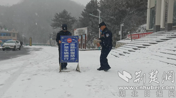 当日中午,海拔1799米的郧西县湖北口乡降雪量不断加大,短时间内暴雪肆虐,道路和山林逐渐被积雪覆盖。湖北口派出所民警冒着大雪前往各陡坡险段开展道路巡查,在积雪结冰路段和弯道处设置安全提醒并限行,积极排除安全隐患。