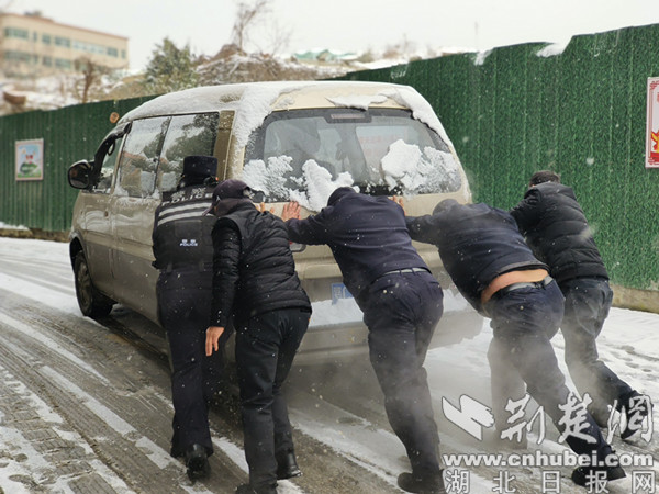 “三、二、一,推!”在茅箭区武当路通达巷,武当路派出所民辅警工作中发现一辆出租车上坡时打滑,便立即上前徒手推车。“谢谢警察同志!今天早上走得早,大意了没有顾得安装防滑措施……”“师傅!冰雪天气,一定要注意行车安全,安装防滑链!”临走前,武当路派出所民警对其再三提醒。
