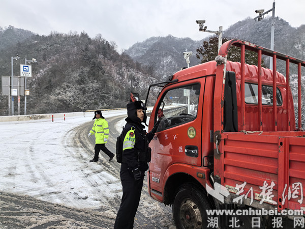 “老乡!前面道路都结冰了,非必要尽量不出行,行车一定要小心啊!”“同志,我今天有点急事要去拉一批货,没想到早上起来路上全是雪……”“你车上有没有防滑链,我帮你安上!前面路滑,一定要注意安全!”8时许,在茅箭区大川镇三岔河大桥附近,大川派出所副所长遇保池一边帮村民安装防滑链,一边嘱咐其注意行车安全。