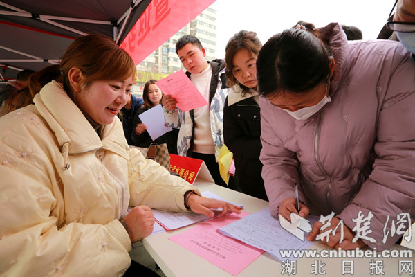 荆楚网(湖北日报网)讯(通讯员 陈昌荣、陈艳、吕刚瑜瑾)“请大家把身份证拿出来,一个一个登记。”2月19日,上午八点30分,竹山县城关镇堵河文化市场人头攒动,湖北贡水源公司办公室主任张芬正在指导求职者进行登记。当日,该县总工会联合县委人才办、县人社局等部门,在堵河文化广场举办“春风送真情、就业暖民心”2024年春风行动暨大学生留(回)堰现场招聘专项行动,县委书记汪正义亲临到场指导。
