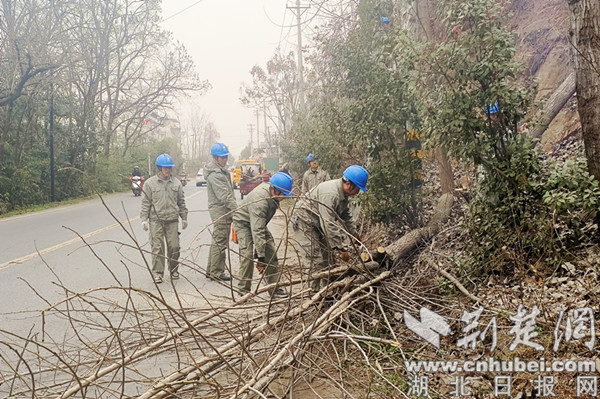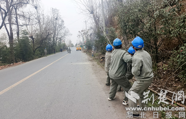 荆楚网(湖北日报网)讯(通讯员 储召清)2月19日,在十堰市竹山县宝丰镇上坝村,国网竹山县供电公司宝丰供电所十几名全副武装的工作人员,正在对高压线下超高树木进行清理。这是该公司快速行动,抢在新一轮雨雪冰冻天气来临之前清除线下隐患,确保“电力生命线”畅通的一个缩影。