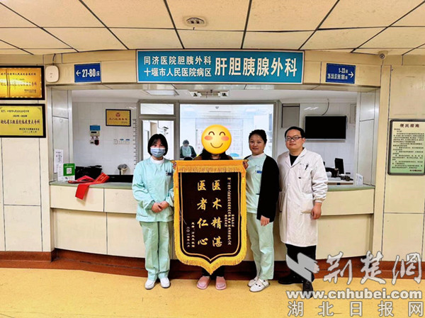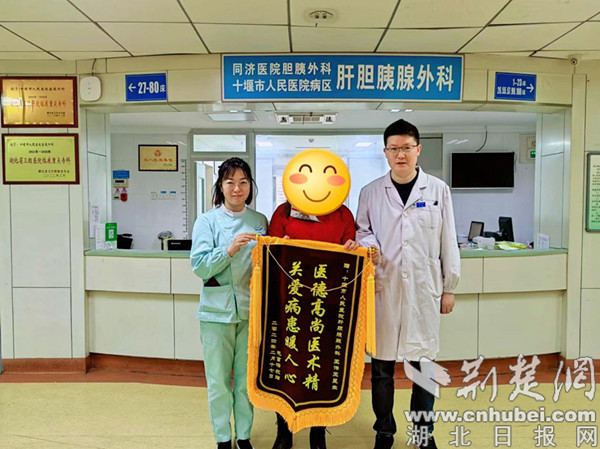 荆楚网(湖北日报网)讯(通讯员 马婷婷、钟欢)2月19日,来自丹江口市的宋先生、陕西省白河县的方先生和丹江口市的陈女士,分别将印着“医术精湛 医者仁心”“医德高尚医术精 关爱病患暖人心”“医术精湛传四方 品德高尚暖人间”的锦旗送到十堰市人民医院肝胆胰腺外科,感谢蔡庆和与涂华医疗团队的精湛医疗技术以及护理团队细致入微的护理服务。