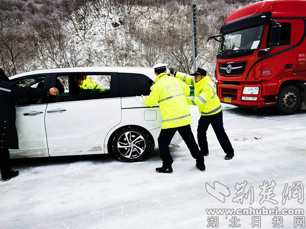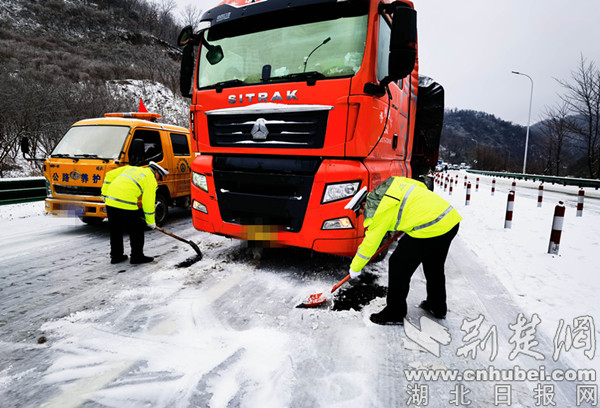 当天,位于丹江口市辖区的馆驿隧道附近气温也非常低,该大货车在抛锚后,很快就被“冻”在了路面上,完全无法发动。交警先是采取了铲雪除冰、撒盐融雪的措施,可是因货车质量过大,效果不明显,在得到车主允许的情况下,民警调来救援车帮忙推车才顺利解困。