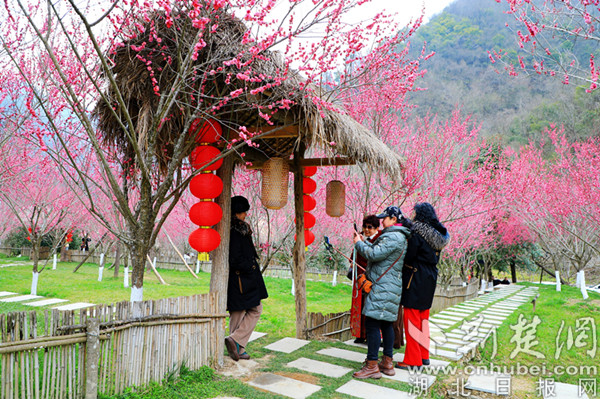 荆楚网(湖北日报网)讯(通讯员 向继华、但兴竹)春风拂过,大地披绿,百花争艳。近日,在湖北省竹山县文峰乡太和梅花谷风景区内,一朵朵粉红色的梅花竞相在枝头绽放。阳光下,花丛间,暗香浮动,沁人心脾,一派生机盎然。大批游客“闻香”而来,拍照留影,其乐融融。