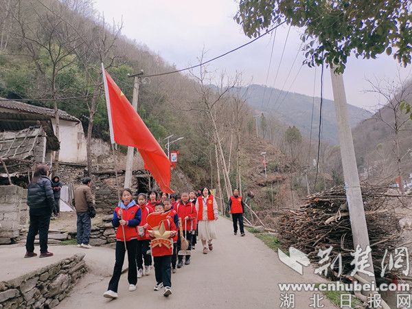 荆楚网(湖北日报网)讯(通讯员 刘方琪、胡梦瑶)“学习雷锋好榜样,忠于革命忠于党,爱憎分明不忘本,立场坚定斗志强……”3月4日,十堰市郧西县羊尾镇郭家中心小学联合“小太阳”护苗工作队组织学生志愿者开展“践行志愿服务,争做追‘锋’少年”新时代文明实践志愿活动。