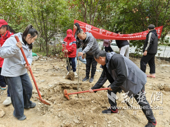 荆楚网(湖北日报网)讯(通讯员 高胜男)3月12日上午,十堰市柳林小学天津路第一校区党员教师代表、共青团教师代表携手少先队员代表,积极响应绿色生态文明号召,开展植树节志愿服务活动,以实际行动弘扬雷锋精神和志愿者精神,践行绿色生态文明理念。