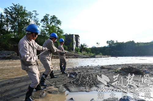 为受灾村民架线送电。通讯员 供图