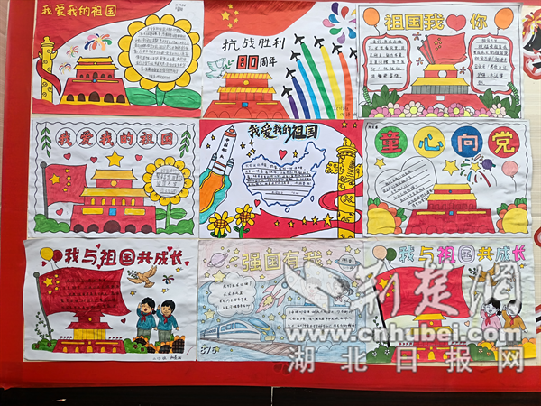 活动自启动以来,各班级师生热情高涨、通力协作:有的班级化身“小小国画家”,用细腻笔触勾勒天安门、长城的雄伟身姿,金黄的稻浪、鲜艳的国旗在画中交织,尽显“山河锦绣”之美;有的班级聚焦“红色记忆”,通过剪纸、贴画再现小英雄雨来、狼牙山五壮士的故事,图文并茂的设计让红色精神浸润童心;还有的班级紧扣“科技强国”主题,将神舟飞船、高铁、港珠澳大桥等元素搬上墙面,用绚烂色彩展现祖国的发展奇迹,更有班级融入家乡变迁图景,用老照片与新画作对比,诉说身边的“家国故事”。