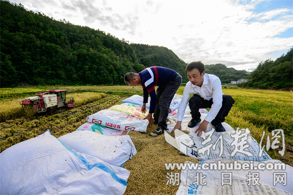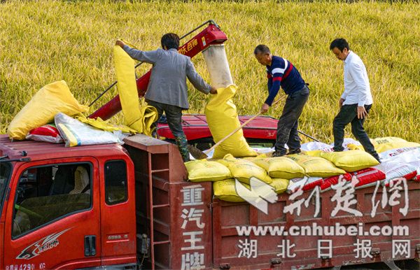 荆楚网(湖北日报网)讯(通讯员 石濡华 王元进 冯定武 )10月13日,竹山县擂鼓镇董家沟村150亩“旱改水”项目区内的富硒晚稻丰产熟透,该村组织收割机械乘着天晴,抢收稻谷,装运至护驾粮食机烘车间,连夜烘干,确保颗粒归仓。
