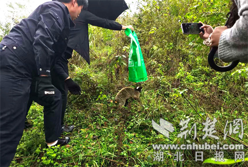 10月17日下午,竹坪乡政府工作人员、派出所民警与林业局野保站技术人员一同驱车前往一处生态环境优良、远离人类密集活动区域的野外林地。在确认周边环境适合花面狸生存后,大家缓缓打开收容箱,这只花面狸犹豫片刻,便敏捷地窜入林中,重新回归自然的怀抱。