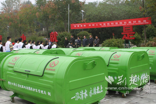 活动现场,丹江口库区省级湿地自然保护区管理局向均县镇政府移交了定制勾臂式垃圾箱16个,用于均县镇收集湿地保护区内村镇日常垃圾,解决辖区居民垃圾“收集难、转运慢”问题,减少人为污染对湿地生态系统的干扰。