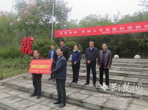 荆楚网(湖北日报网)讯(通讯员 沈伟 金杰 李镇海)10月28日,由十堰市林业局、湖北丹江口库区省级湿地自然保护区管理局、丹江口市林业局、均县镇政府联合主办,主题为“丹江口库区湿地保护联建共管”暨垃圾收集设备捐赠活动在丹江口市均县镇举行。十堰市、县林业系统干部职工及环保志愿服务队60余人参加活动。