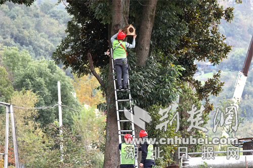 活动现场,县林业局野保站工作人员与志愿者们分工协作,穿梭于林间安装鸟巢。这些鸟巢堪称鸟类的“个性化住宅”:针对山雀设计的精致“单间”小巧玲珑,为喜鹊等中型鸟类打造的“套房”宽敞舒适,专为“鸟中仙子”白鹭定制的开放式“别墅”更是贴合其栖息习性。工作人员小心翼翼地将鸟巢固定在树枝高处,每一个动作都饱含对鸟类的关怀。