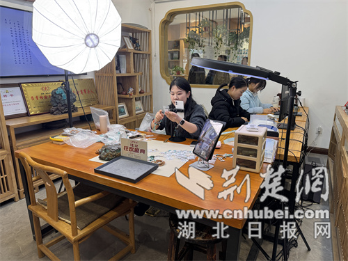 荆楚网(湖北日报网)讯(通讯员 但兴竹)“想买到高品质绿松石,有‘色、质、净、工’四字口诀——颜色要饱和匀净,瓷度决定品相和耐久性,颜色纯净均匀无杂质,工艺也得好。”11月5日走进十堰市竹山县麻家渡镇的如意绿松石工作室,主播小霞正在直播间向网友传授挑选绿松石的“秘诀”。
