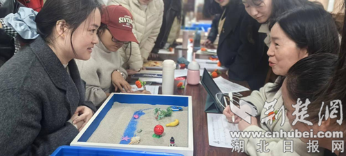 接着,以沙盘疗法作为培训的核心,围绕“理论 + 实操” 展开。理论讲解环节,陈红老师结合实践经验,从沙盘疗法起源、多拉・卡尔夫沙盘游戏理念切入,借案例解读其在儿童疏导、青少年情绪调节等场景的应用,让教师理解沙盘是 “无声语言”,需专业解读。实操环节,教师分组扮演“来访者”与“咨询师”,沉浸式体验创作与咨询。针对信任建立、沉默引导等问题精准点拨,助教师掌握核心技巧。后续专题分享中,专家结合学生特点,提供沙盘课程设计、心理评估、干预方案等落地策略,明晰应用路径。
