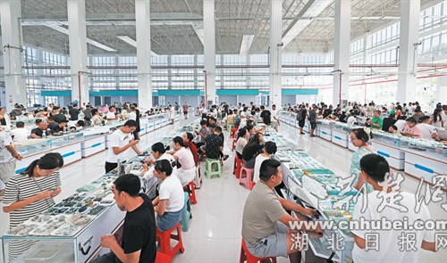 从竹山县城出发,经麻安高速,约25分钟便到达麻家渡镇。该镇是全国绿松石集散中心,获评中国“淘宝镇”,镇内营盘河村、罗家坡村被命名“淘宝村”。集镇沿305省道而建,加工、销售绿松石的商铺一个挨一个,绵延3公里,被称为“宝石一条街”。每天,各家店铺的工作人员直播、雕刻、抛光,忙得热火朝天,从天南海北来这里“淘宝”的人也是络绎不绝。