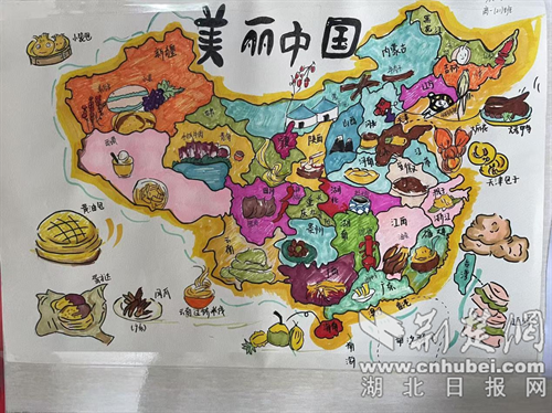 “创作过程中,同学们有许多创新巧思。“高一年级主任、地理教师王栋梁说。有的同学聚焦自然之美,以细腻笔触勾勒出西藏布达拉宫的巍峨壮丽,用灵动线条描绘出桂林山水的秀美灵动,更以渐变色块巧妙还原从东北林海的苍茫到江南水乡的柔美,生动展现出祖国山河的壮丽多姿。有的同学主打“舌尖地理”,在地图对应区域精心标注出四川火锅的麻辣鲜香、上海生煎的酥脆可口、新疆手抓饭的醇厚美味,并配以栩栩如生的食材插画,制作出一张张令人垂涎欲滴的“美食地图”。