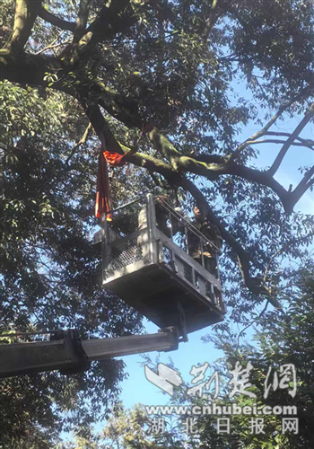 荆楚网(湖北日报网)讯( 通讯员 冯春苔 肖明辉 张义生 李镇海)11月18日,在黄龙林场老母荒林分区“三棵树”景区,吊车工人操作高达数十米的机械长臂,将林业技术员举送至古树的树冠深处进行修枝。