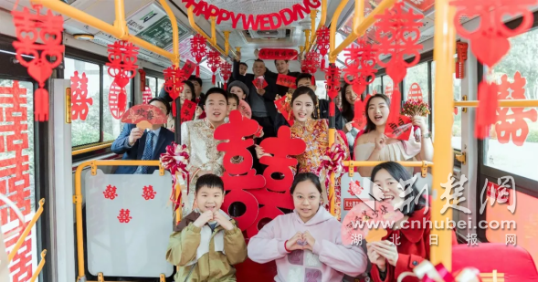 荆楚网(湖北日报网)讯(通讯员陈国东)红毯铺地,“喜”字挂窗,丝带缠绕……11月16日,十堰市郧西县这对新人以“公交婚礼”改写年轻人“婚礼习俗”的新模式。一辆满载着“喜庆”的公交车,缓缓行驶在街道上,车厢内一片欢声笑语,车窗外沿途市民纷纷驻足挥手,沿途的路人笑着送上祝福,为他们的喜事道贺。