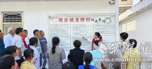 郧西县观音镇村民倾听志愿者宣讲村规民约。郧轩文摄