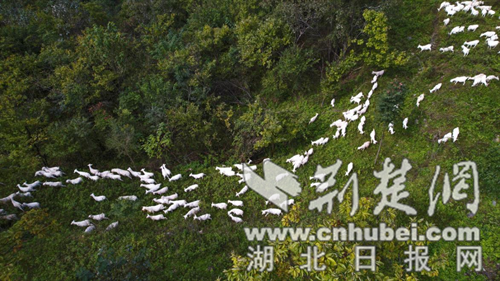 郧西县香口乡沉溪河村千只马头山羊在山坡上觅食。通讯员 邹景根 摄