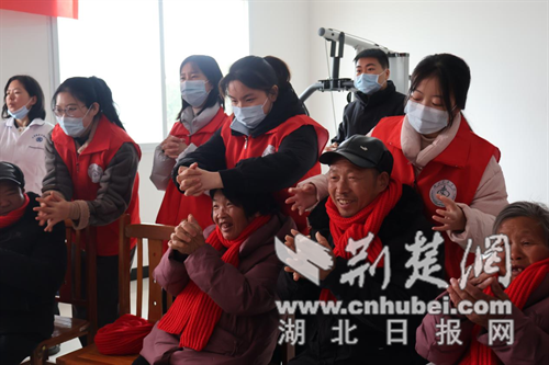 在石鼓镇农村福利院,湖北医药学院护理学院研究生党员为老人们赠送围巾、手套等暖心礼物。志愿者们还为老人进行了歌唱表演、手势舞、击鼓传花等活动,展示了海姆立克、绷带包扎术等急救知识实操。研究生党员带领老人学习“健脑”健身操,现场欢声笑语不断。活动现场还同步开展义诊活动,护理学院师生为老人进行了血压、血氧测量及口腔健康筛查。
