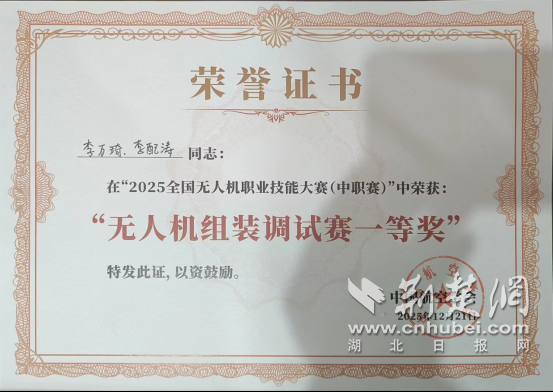 荆楚网(湖北日报网)讯(通讯员 钱芹)12月21日,2025全国无人机职业技能大赛(中职赛)在浙江台州技师学院圆满落幕,丹江口市汉江科技学校参赛代表队凭借扎实的理论功底、精湛的实操技能与默契的团队协作,从全国56支参赛队伍、393名选手中脱颖而出,斩获大赛多个奖项。其中无人机组装项目李万琦、李配涛同学获国赛一等奖;无人机理论项目李欣冉、蒋上茁、张梦楠同学获国赛二等奖,李万琦、李配涛同学获国赛优秀奖;无人机搜救项目蒋上茁同学获国赛三等奖。