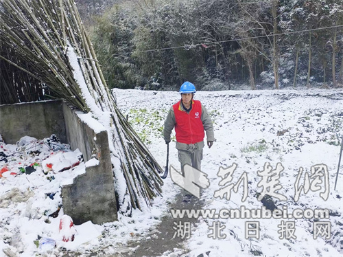 在竹山县宝丰镇高望山村,皑皑白雪覆盖了田野与山路,宝丰供电所运维人员身着红色马甲、头戴蓝色安全帽,深一脚浅一脚地行走在积雪的田埂和陡坡上。他们手持巡检工具,对辖区内的供电线路、电杆及附属设备进行全面排查,重点查看线路覆冰、树竹障隐患等情况,不放过任何一处可能影响供电的细节。从平整的雪田到崎岖的山路边坡,巡线人员的身影穿梭在银装素裹的山野间,用脚步丈量着供电线路的安全防线。