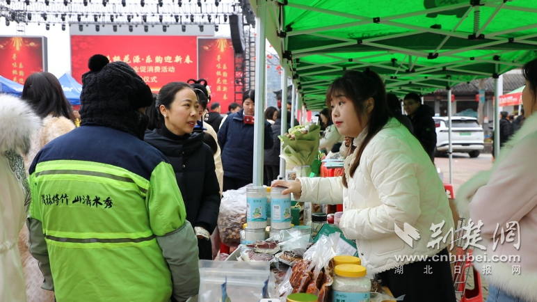 年货市集作为本次活动的重要一环,吸引了众多市民前来选购。现场摊位林立,商品琳琅满目,从道地药材、健康饮品到农特食品、日用百货,应有尽有。湖北省秦巴大潘商贸有限公司总经理潘伟已是第四次参加县里组织的年货节。他带来的手工豆腐乳、竹山糖包花和红薯干系列产品备受青睐。“刚开摊就卖了1000多元,现在营业额已经突破3000元了,”潘伟高兴地说,“现场氛围一年比一年好,年味越来越浓!”