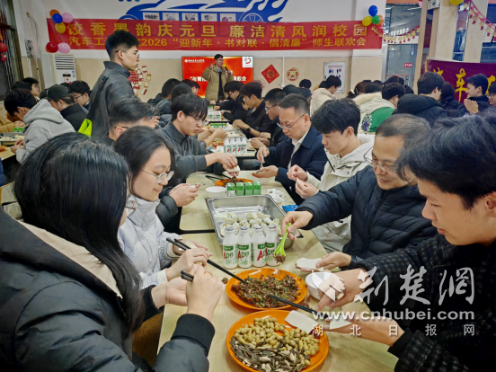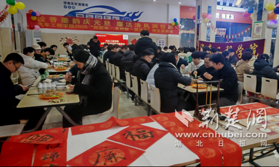 荆楚网(湖北日报网)讯(通讯员 甘甜 周彬 迪力亚尔)红纸铺展迎新岁,饺子飘香迎新年。12月31日,湖北汽车工业学院汽车工程学院在桃园食堂举办“迎新年·书对联·倡清廉”师生联欢会,学院领导班子、教师代表与近百名学生欢聚一堂,手包寄托新年美好祝福的饺子,笔书承载“廉洁初心”的春联,在温暖的人间烟火味儿中闲叙师生情谊。校党委常委、副校长王生怀及部分职能部门负责人出席活动。