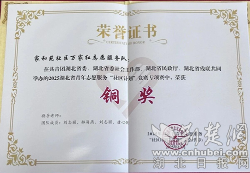 荆楚网(湖北日报网)讯(通讯员 赵森 向玉贵 刘志丽)近日,由共青团湖北省委联合省委社会工作部、省民政厅、省残联等单位共同举办的2025年湖北省青年志愿服务“社区计划”竞赛决赛在荆门举行。十堰市张湾区红卫街道家和苑社区万家红志愿服务队凭借其“‘家’点幸福”志愿公益集市项目,在全省众多优秀项目中脱颖而出,荣获专项赛铜奖。