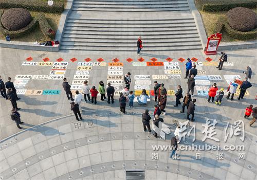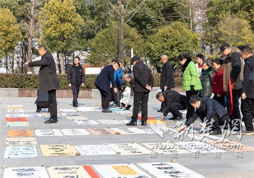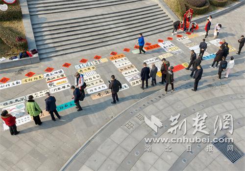 当天,在秦巴文化艺术中心广场,竹山县书画家协会组织的一场别出心裁的露天展览吸引了众多市民目光。协会将此次笔会及近期会员精心创作的共计57幅书画作品,巧妙排列成巨大的“2026”字样。红色福字、水墨骏马、人物山水等系列作品在冬日的阳光下格外醒目,组合成一道兼具艺术美感与节日仪式感的独特风景线。喜庆祥和的氛围扑面而来,令过往市民纷纷驻足,细细观赏和品味,不时拿出手机拍照留念,提前感受到了浓浓的年味。
