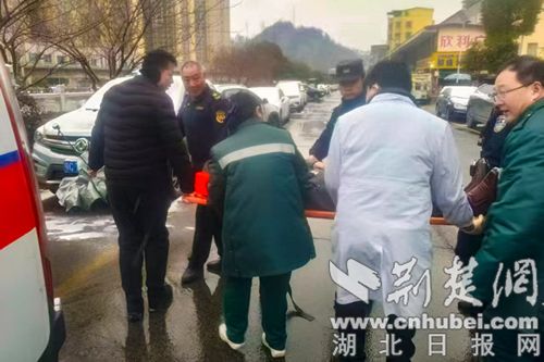荆楚网(湖北日报网)讯(通讯员 刘爱理 李恺 王臻)1月19日下午4时许,大雪纷飞。十堰经济技术开发区白浪街道综合执法中心执法人员郑隆巍、李喜胜在祥安广场执勤时,接到群众紧急求助:附近有一名老人摔倒。两人迅速赶赴现场,发现老人倒在雪地中,意识不清。在多次尝试唤醒并询问家人联系方式未果后,执法人员立即报警并同步拨打120急救电话。随后赶到的民警通过老人随身携带的手机联系上家属,执法人员、民警与迅速抵达的医护人员合力将老人抬上救护车,送往医院救治。