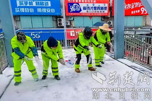 环卫部门工作人员在桥面喷洒融雪剂、清理积雪。通讯员 供图