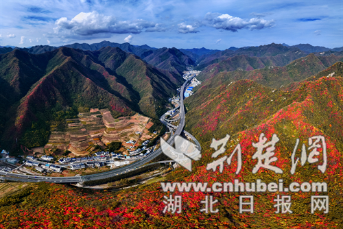 竹山县双台乡红叶漫山,高速路如丝带般与外连接。石濡华 摄