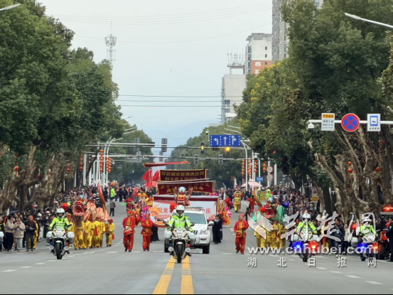 荆楚网(湖北日报网)讯(通讯员 夏凡 李宇杭) 3月1日(农历正月十三)上午,房县“诗酒美城·福满房县”正月十三民间文艺大巡游如期举行。46支巡游队伍、2000余名演职人员自房县唐城广场出发,沿1.5公里长街踏歌而行。10时许,天降喜雨,近20万余名群众热情不减,冒雨观看。