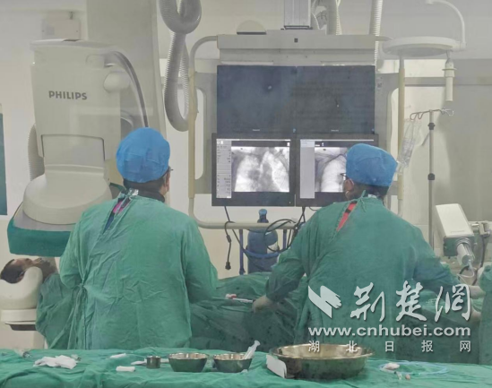 据了解,3月23日深夜,这位老人因肺癌侵蚀血管出现大咯血,血压下降,胸闷、憋气,半夜在就医途中四次出现昏迷命悬一线。从房县姚坪出发时家属打电话给十堰市中西医结合医院胸脑外科医生孙勇,要求科室做好抢救准备。科室接到电话后于凌晨2点钟在病人入院前做好了抢救准备工作。3点患者到达,当时患者口鼻及颈部有血迹、呼吸困难、面色苍白、口唇青紫,血压70/50mmHg(休克血压),处于失血性休克、窒息状态。医生护士齐上阵清除口、鼻凝血块保持呼吸道通畅、输液稳定血压、止血治疗缓解肺内大出血、吸氧等一系列抢救措施后患者咯血逐渐减少、呼吸好转、血压回升,暂时稳住了病情,但是还存在再次大出血风险,需要进一步治好“病根”。