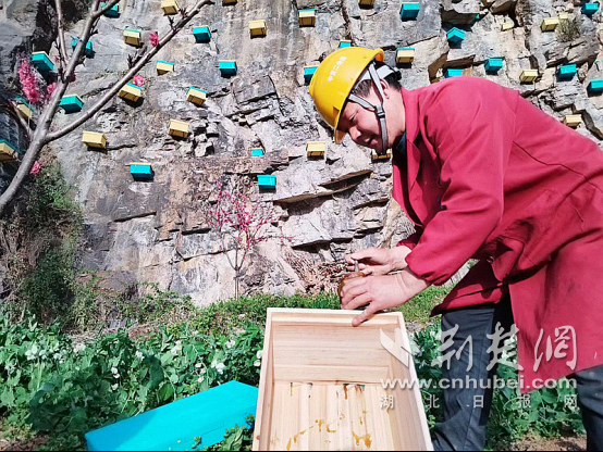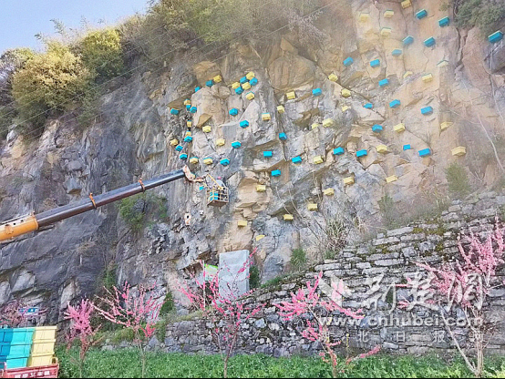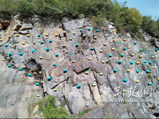 荆楚网(湖北日报网)讯(通讯员 向继华 邱亮)4月6日,在十堰市竹山县官渡镇桃源村的242国道旁,一幅独特的“蜂”景正吸引着过往行人:陡峭的崖壁上,数百个蜂箱如繁星般点缀,工人们正紧张有序地进行吊装作业。