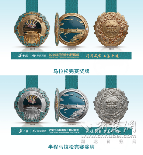 完赛奖牌以武当太极圆为外形,采用双层镂空翻盖结构,融合武当金顶、丹江口大坝、东风汽车标志等元素,实现“一牌藏三景,开合见十堰”,马拉松、半程马拉松奖牌分别为金、银色,成为兼具收藏与纪念价值的文化载体;参赛服以武当水墨渐变绿为主色调,版型舒适透气,让跑友在奔跑中沉浸式感受十堰的山水之美与文化底蕴。