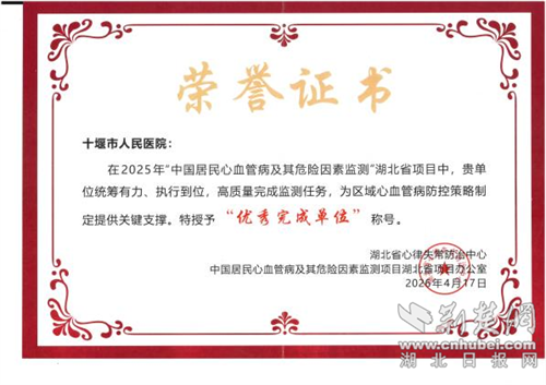 荆楚网(湖北日报网)讯(通讯员 张文均)4月17日,中国居民心血管病及其危险因素监测项目湖北省总结交流会在武汉召开。十堰市人民医院作为十堰市该项目技术指导单位、执行单位,圆满完成国家重大公共卫生任务,凭借组织规范、数据精准、群众满意、成效突出,荣获两项荣誉证书,并受邀在大会作典型经验交流发言,成为全省项目执行标杆。