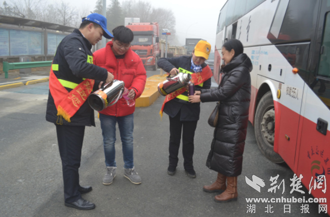在浓浓的大雾中,突然有司乘大声喊道:“开水来了!”。入口广场等候的车队中很快人头攒动起来,原来是身披红绶带的随州所志愿者服务队来了。司乘们高兴地围过来,有的倒开水暖暖身子,有的来泡面充饥,还有的来给宝宝冲牛奶。当一杯杯开水递到他们手中的时候,大家等候的急躁无奈情绪得到了舒缓。一位长途货车司机端着杯子满意地说:“你们人好水也甜!”