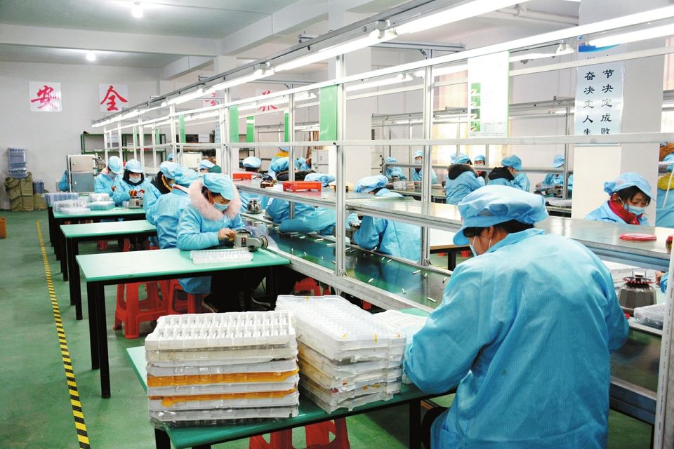 湖北允升科技有限公司新街分公司是一家主要生产聚合物理锂子软包圆柱电池、软包方形电池,集科研、生产、销售为一体的新能源技术企业,日生产电池4万多支,带动当地70余人实现家门口就业,年创税收300余万元。图为生产车间一角。(特约记者程鹏摄)