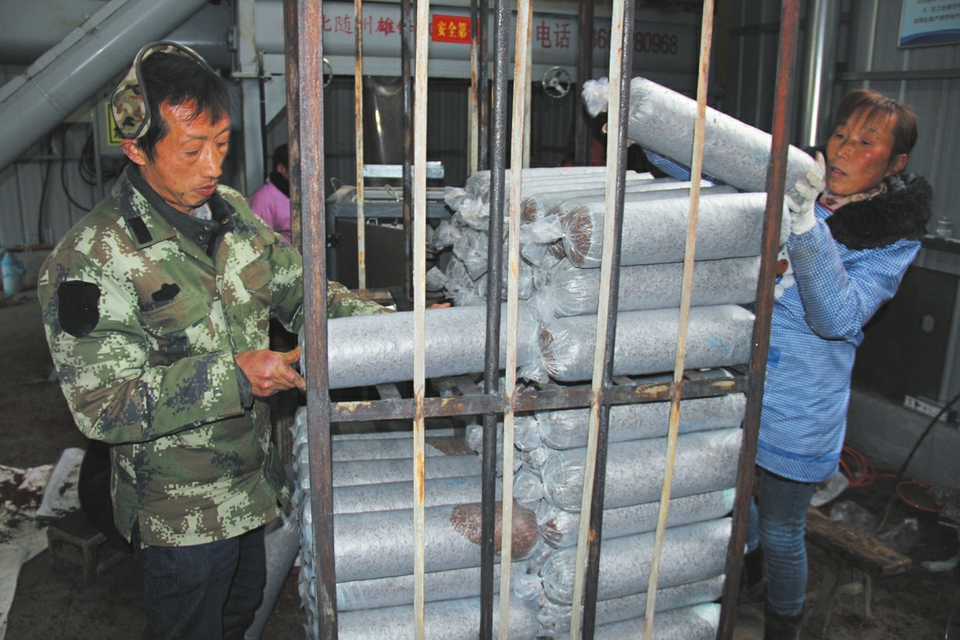 曾都区洛阳镇邱畈村以集中制棒、分户管理的方式发展香菇产业,带动贫困户脱贫。右图为该村新建的30个香菇棚,其中18个菇棚交给贫困户免费使用;下图为1月14日贫困户在年产30万棒的机械化流水生产线上装袋制棒。(随州日报通讯员金昭宇摄)