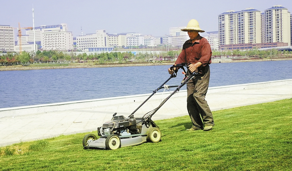 己亥年世界华人炎帝故里寻根节已经进入倒计时,随县烈山湖风光带管理人员积极行动,用新投入的剪草机平整草坪,提高了风光带草坪绿化水平。(随州日报全媒体记者孙洪涛、通讯员龚承斌摄)