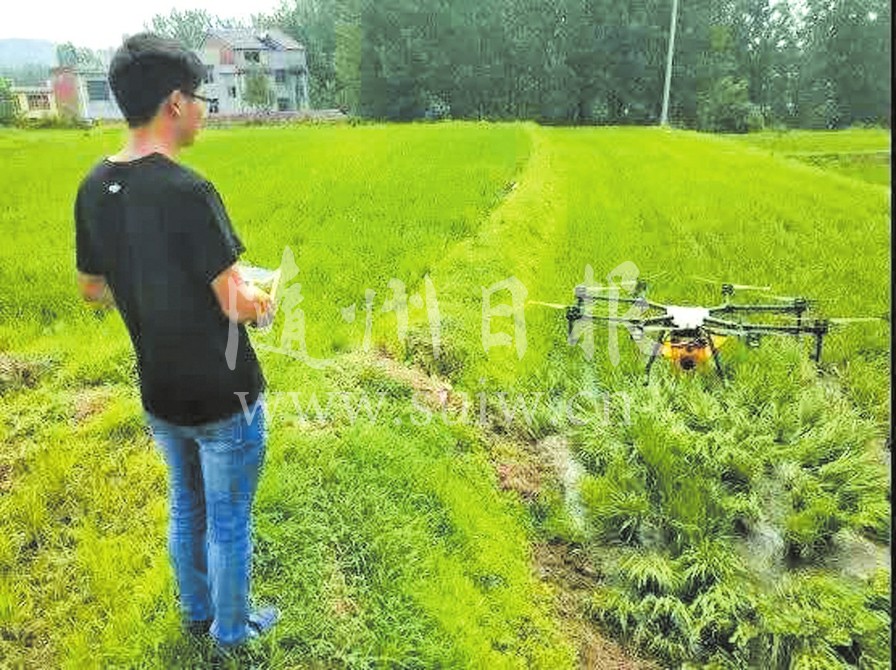 当前,正值水稻田间管理时节,随县供销社组织所属服务机构开展系列服务农业生产工作,助力农业增产、农民增收。图为该社为随县高城镇大桥村一组150亩水稻开展无人机除草、防虫治病服务。(随州日报通讯员宫霄摄)