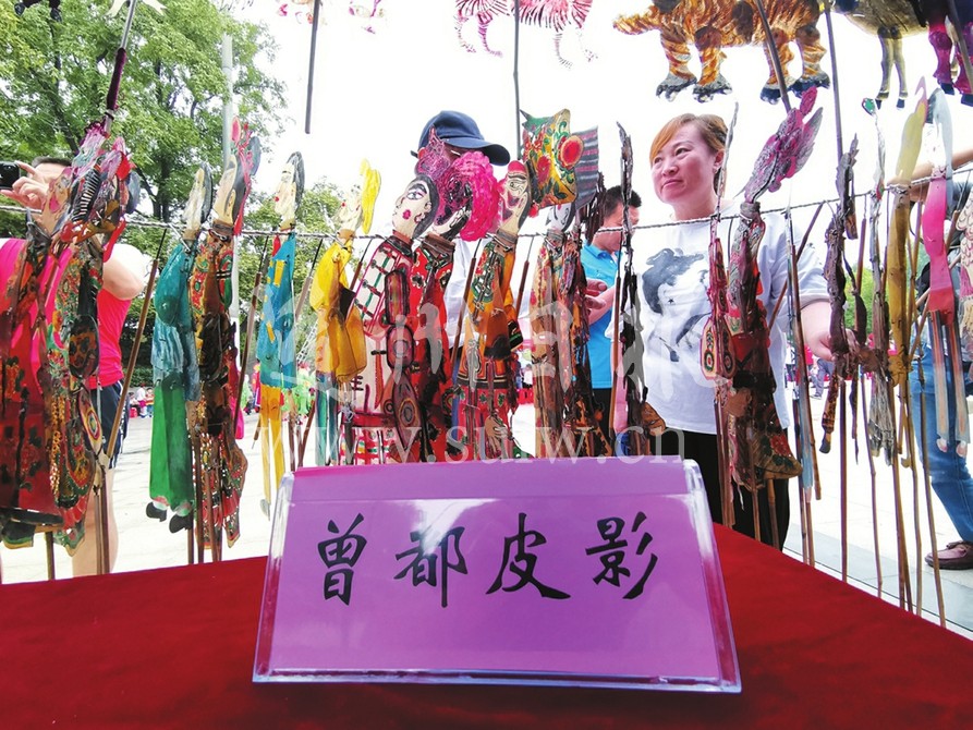 6月22日,随州市2019年非物质文化遗产展演展示活动在神农公园举行。活动分动态展演和静态展示两个区域,以非遗作品展示、非遗手工技艺演示、非遗成果展示及专场文艺展演等群众喜闻乐见的形式,展示随州非物质文化遗产的独特魅力。图为皮影展示区。