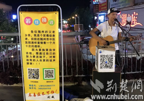荆楚网客户端—荆楚网消息(通讯员 何娇、敖勋、李郑)7月14日晚,夜幕刚刚降临。身患尿毒症的刘威拖着沉重的音响来到随州城区大十字街天桥,展开海报,支上话筒,手机连上音响,以一曲郑智化的《水手》开始了他今晚的卖唱筹钱换肾演唱。