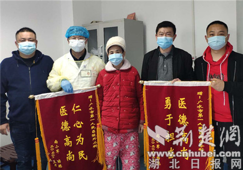3月30日,聂女士病情好转,出院回家休养。身体转好后,聂女士在家属的陪同下,将两面分别写着“医德高尚 勇于担当” 、“仁心为民 医德高尚”字样的锦旗亲手送到了广水一医院医务科主任雷楚林和普外科主任程灯手中,来表达她的深深谢意。