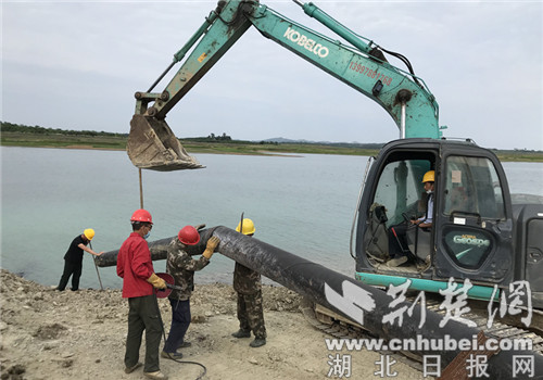 荆楚网客户端—荆楚网消息(通讯员 钟克波、闵礁)挖掘机将吸水管缓慢抬起,工人对接好后将水管放入水中,然后进行焊接……5月28日,在随州城区供水水源地——先觉庙水库取水口,随州玉龙供水公司的员工在对应急提水泵站进行改造。