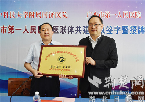 荆楚网(湖北日报网)讯(通讯员王琪、何亚凌)6月5日上午,华中科技大学同济医学院附属同济医院与广水市第一人民医院正式签订医疗联合体共建协议。两院将以此为契机,充分发挥“医联体”优势,开展优质医疗卫生资源下沉,以点带面,助力基层医疗服务水平全面升级,为广水人民带来更多的健康福利。